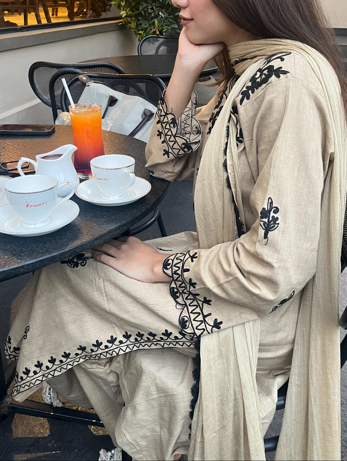 The Shiza Set blends timeless elegance with modern grace. Crafted in a soft beige tone with intricate embroidery and a flattering flowy silhouette — perfect for festive occasions, brunches, or elegant evenings. ✨